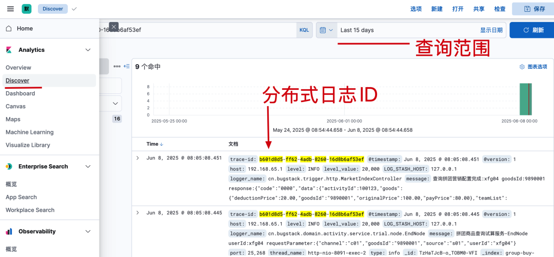 步骤 1: 经过索引查询,我们确定了一个名为 `group-buy-market-log-2025.06.08` 的索引,该索引包含了日志记录。在分析索引字段映射之后,发现字段 `message` 是存储日志内容的主要字段。因此,我们构建了一个搜索查询来查找日志中与“限流”相关的记录。