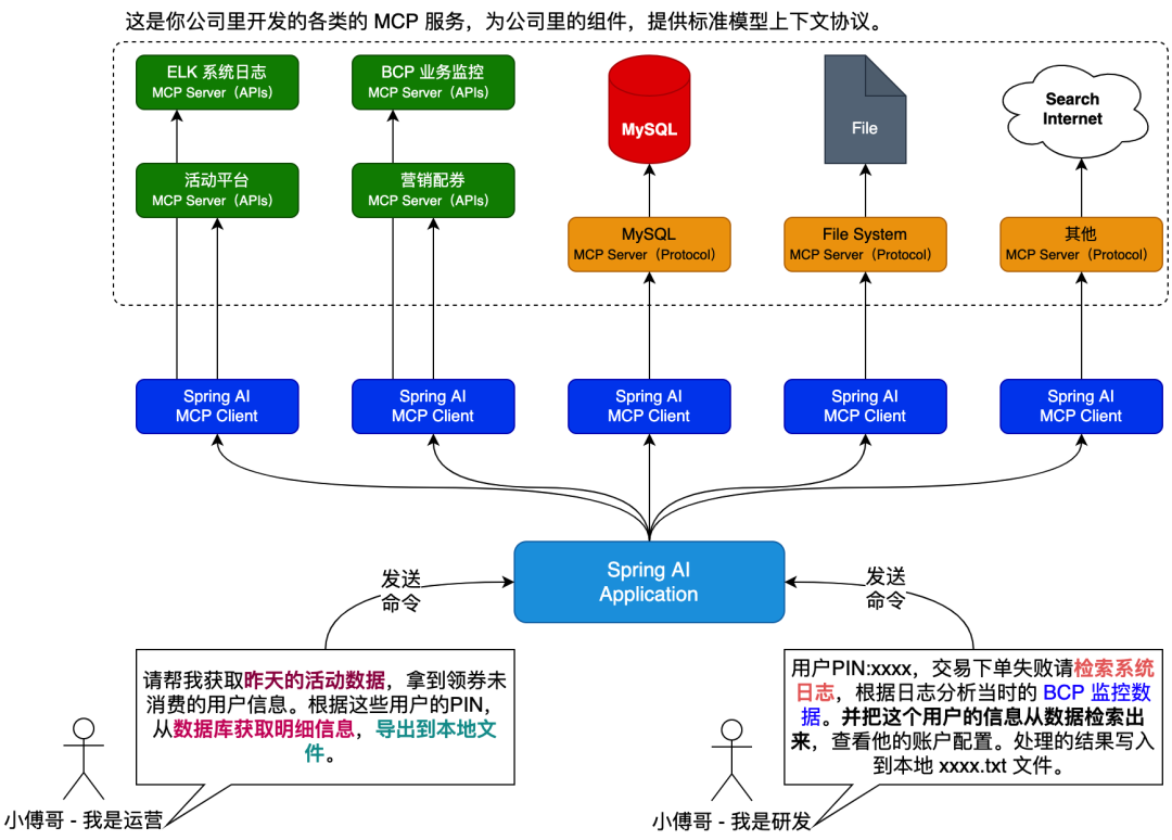 所以,结合这样的场景,小傅哥在带着大家的实战项目,也逐步的引出关于 Ai 在应用项目上的提效处理。今天分享的一个场景就是基于 Ai MCP 分析系统的 ELK 日志。后面还会分析关于监控、数据库一起分析。