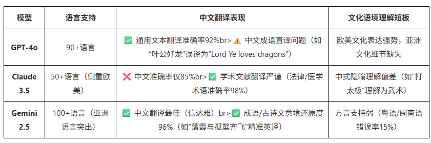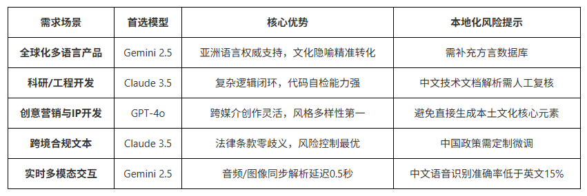 商务合同本地化:Claude > Gemini > GPT-4o(因法律术语严谨性)