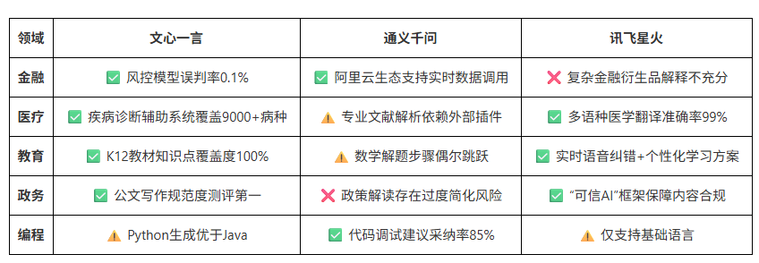 关键发现: 文心一言在跨领域知识融合(金融+医疗+政务)表现最优;讯飞星火深耕教育垂直场景;通义千问开源生态支持开发者扩展专业能力。