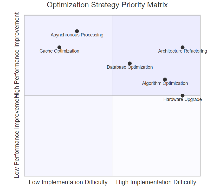 从象限图可以看出,缓存优化和异步处理是性价比最高的优化策略,应该优先实施。