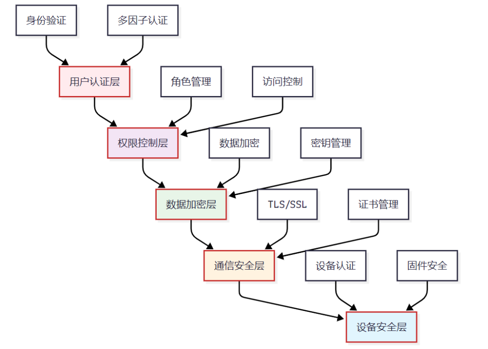 图3:安全架构层次图 - 展示了从用户认证到设备安全的多层防护体系