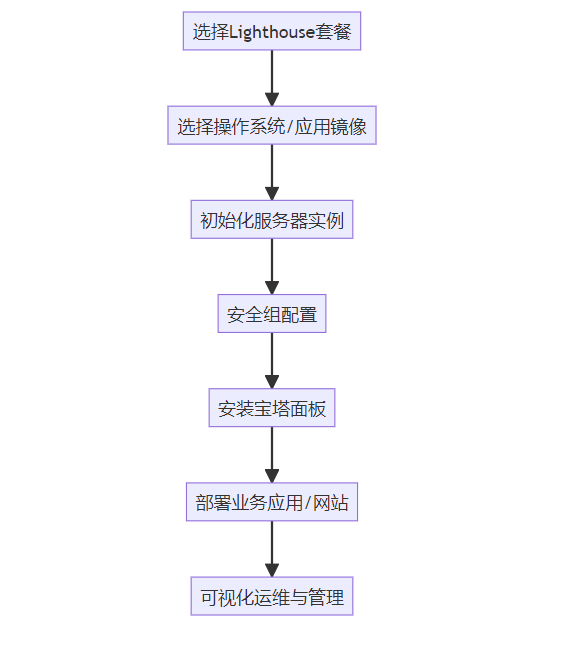 下图展示了腾讯云轻量应用服务器上部署Lighthouse与宝塔的主要流程: