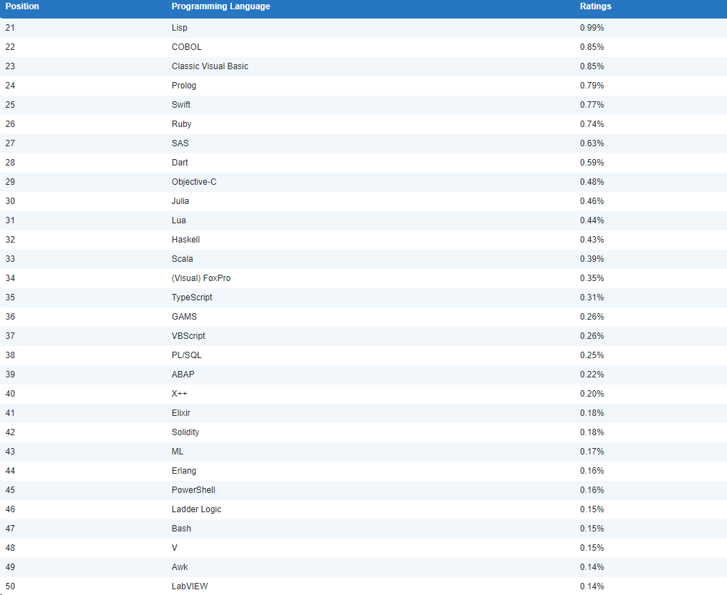 以下列表列出了排名第51至第100位的编程语言。由于差异相对较小,编程语言仅按字母顺序列出。