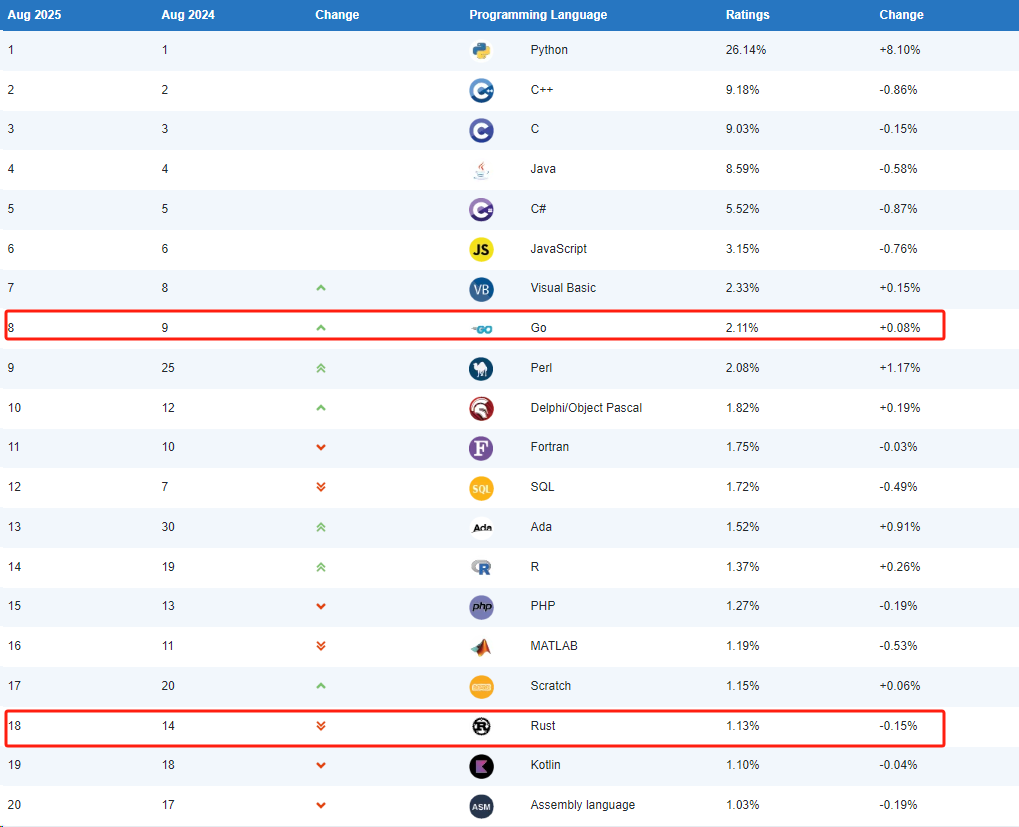 根据上图,go语言相对7月份,排名下降了1位。rust语言排名不变。