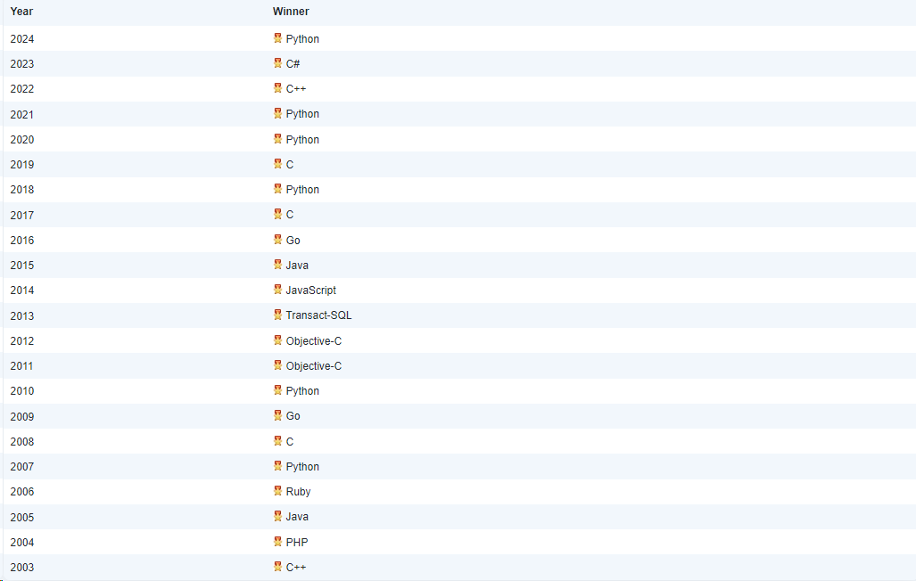 下面展示了所有“年度编程语言”奖项的获奖者列表。该奖项授予当年排名涨幅最大的编程语言。