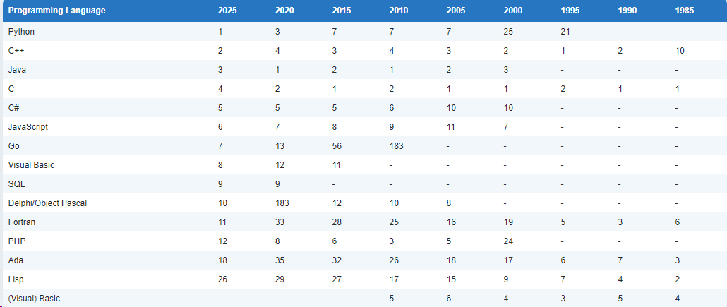 这一趋势在TIOBE指数中也有所体现,我们看到排名靠前的语言正在进一步巩固。为什么要去学习一个没有AI辅助、鲜为人知的新语言呢?这在现代其实意味着你不想去学习一个几乎没有文档支持和/或缺乏丰富库资源的新语言。