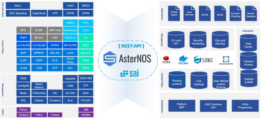 为了更加充分地发挥开源开放的力量,AsterNOS还在SONiC云原生的架构之上提供了强大的SDK能力——用户可通过丰富的API(RESTful API和系统级API)在网络设备上简单快速地开发第三方APP,以及与各种开源运维工具/平台无缝集成。