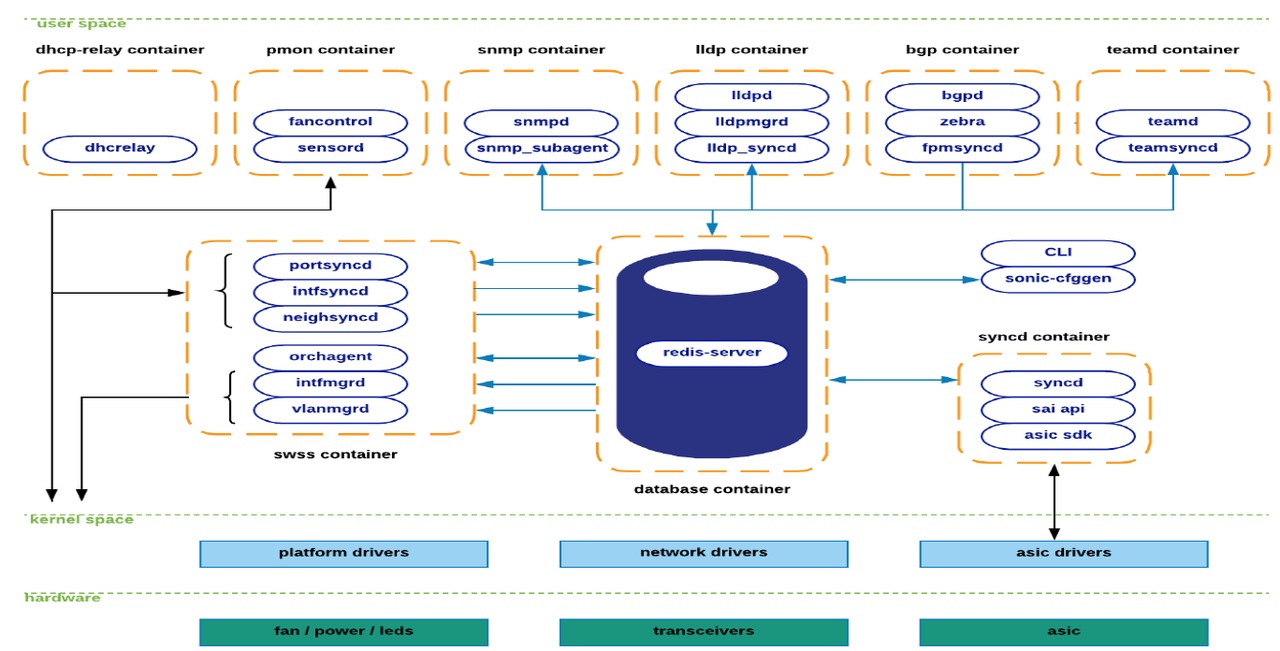 SONiC构建在Linux系统之上,并且利用键值数据库(redis)、容器技术(docker)、标准化硬件接口定义等技术,使其成为一个软硬件彻底解耦、软件模块松耦合(loose coupling)、高可靠、易于扩展、开源开放的网络软件系统。其架构特点主要体现以下几个方面: