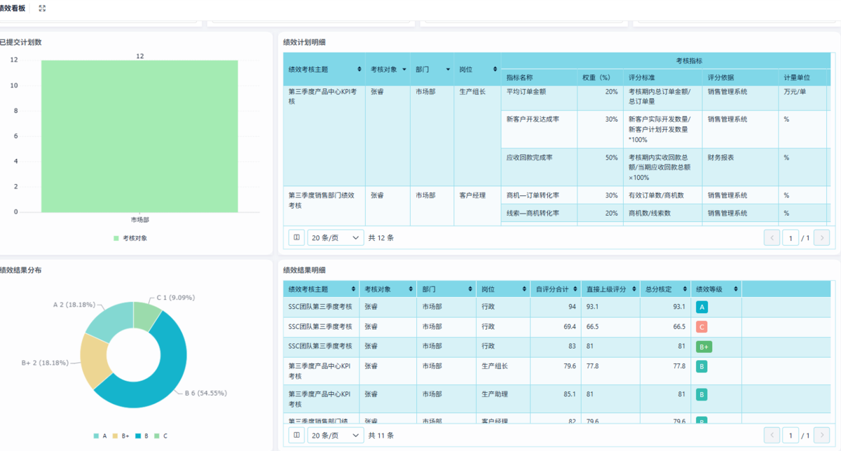 功能:KPI/OKR/目标设定、周期评估、360 度评估、绩效评分、绩效面谈记录、绩效复议。