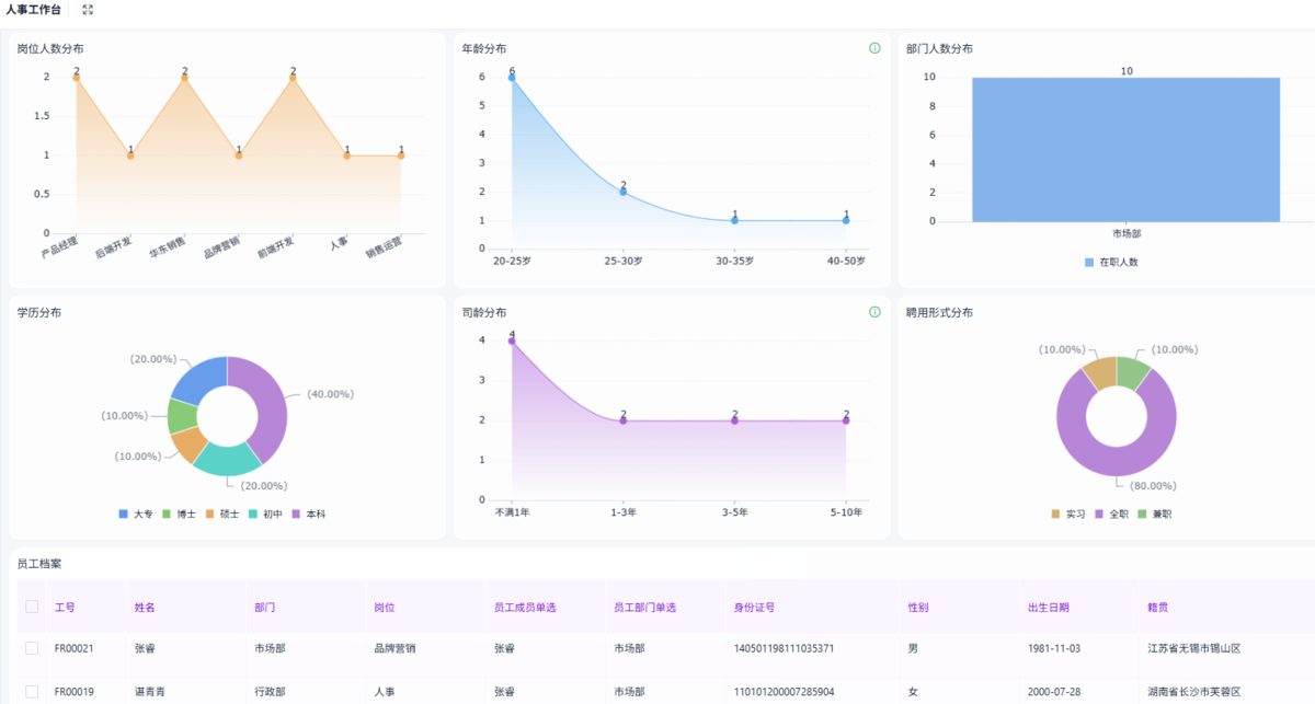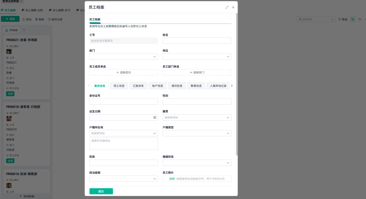 功能:员工基本信息、合同、证照、培训记录、资格证书、历史任职记录、家庭信息、紧急联系人。