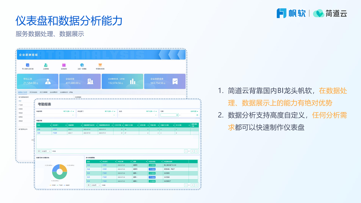 在这里我给大家推荐一个业务人员就能够直接上手的高性价比、零代码平台——简道云人事及OA管理系统,简道云背靠国内BI龙头帆软,在数据处理、数据展示上的能力有绝对优势,数据分析支持高度自定义,任何分析需求都可以快速制作仪表盘,人事及OA管理系统实现了组织人事、考勤、绩效、薪酬、招聘等人事核心模块全面线上化、一体化,业务流程效率提升