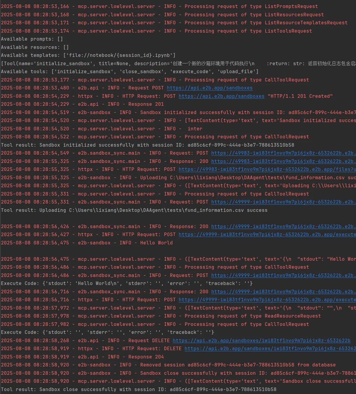 这里我选了基于E2B的coding沙箱来搭建MCP server,刚好为下一章我们手搓数据分析智能体做个铺垫,完整代码详见: DAAgent