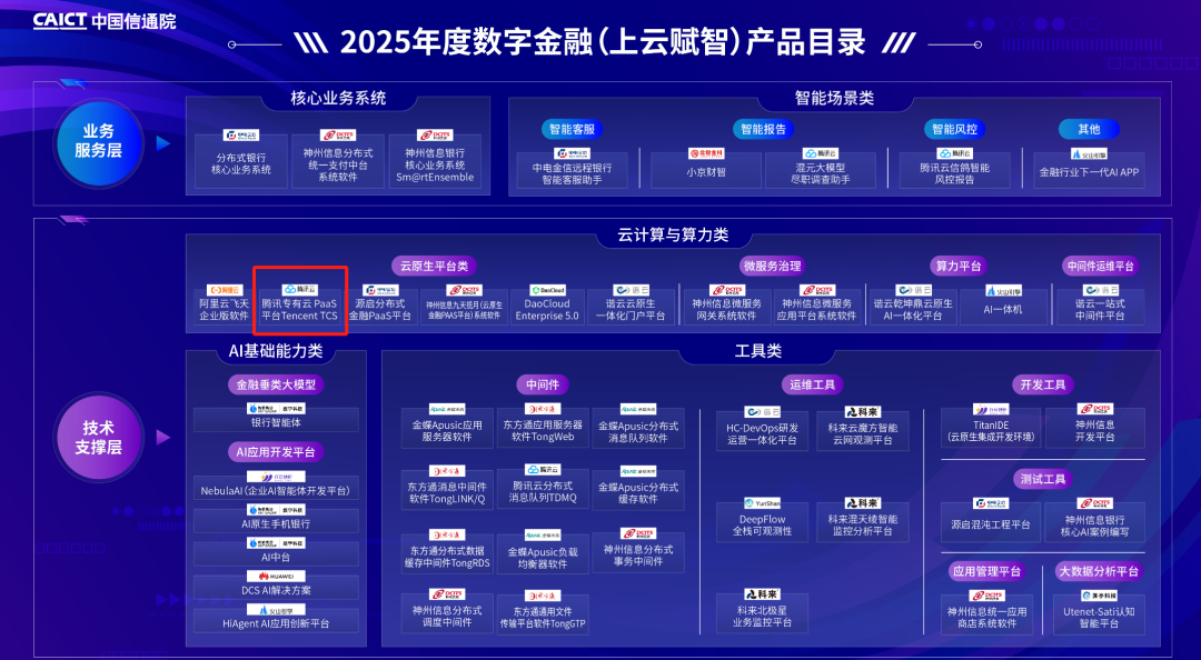 近日,由中国信息通信研究院重磅发布的《2025数字金融(上云赋智)产品目录》 正式出炉。该目录旨在落实中央金融工作会议对科技金融与数字金融的战略部署,甄选助力金融业安全高效转型升级的标杆方案。腾讯专有云PaaS平台(简称 TCS)凭借其在多家银行、证券机构的成功实践与创新技术实力,历经严格遴选,成功入选“云原生平台类”推荐方案名录,获权威认可!