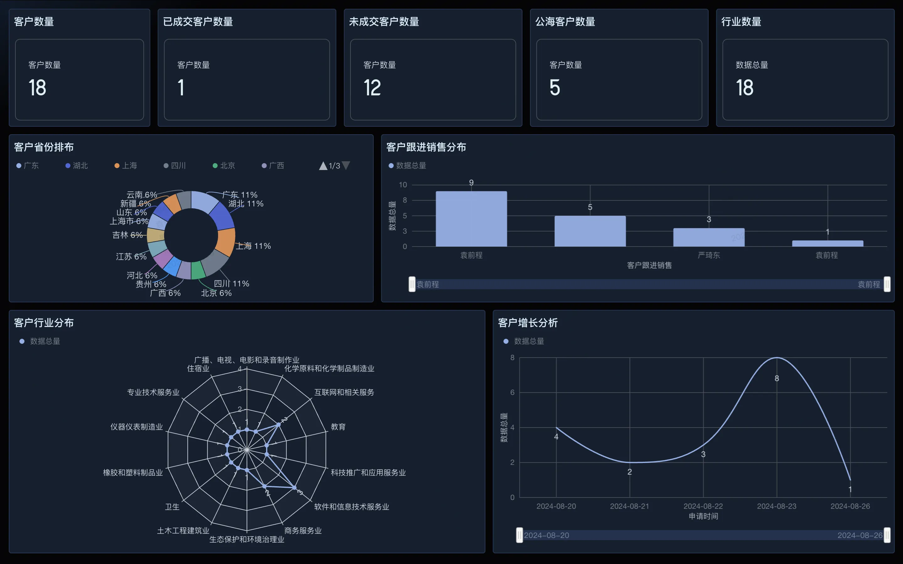 简道云的数据可视化功能包含基础图表类型(柱状图、折线图等),支持按日/周/月维度汇总客户数据。其数据看板的配置方式较为简洁,适合制作标准化的客户统计报表,如月度新增客户数量、各销售小组的客户跟进量等。在数据导出方面,支持将报表以Excel格式下载,满足线下分析需求。