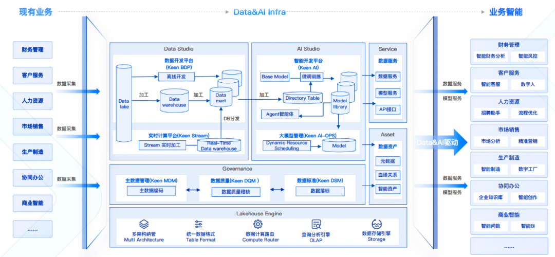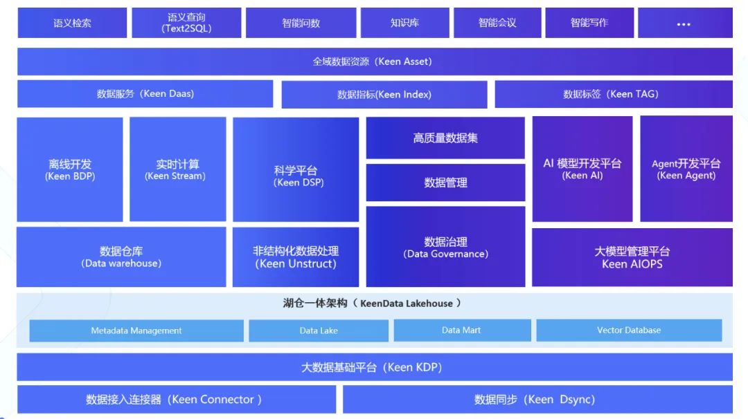 KeenData Lakehouse2.0 采用 AI-Native 智能驱动架构,实现 Data&AI 工程一体化能力。平台面向大型组织进行数据与 AI 体系化落地,提供数据集成、离线实时开发、多模态计算、数据治理、数据集管理、AI 模型构建、训推一体至 Agent 开发全链路闭环的基础设施产品。