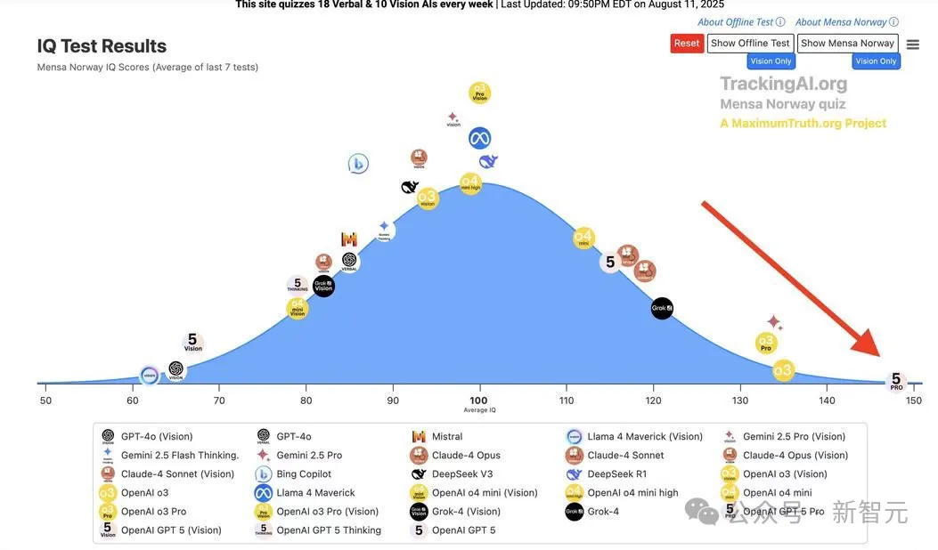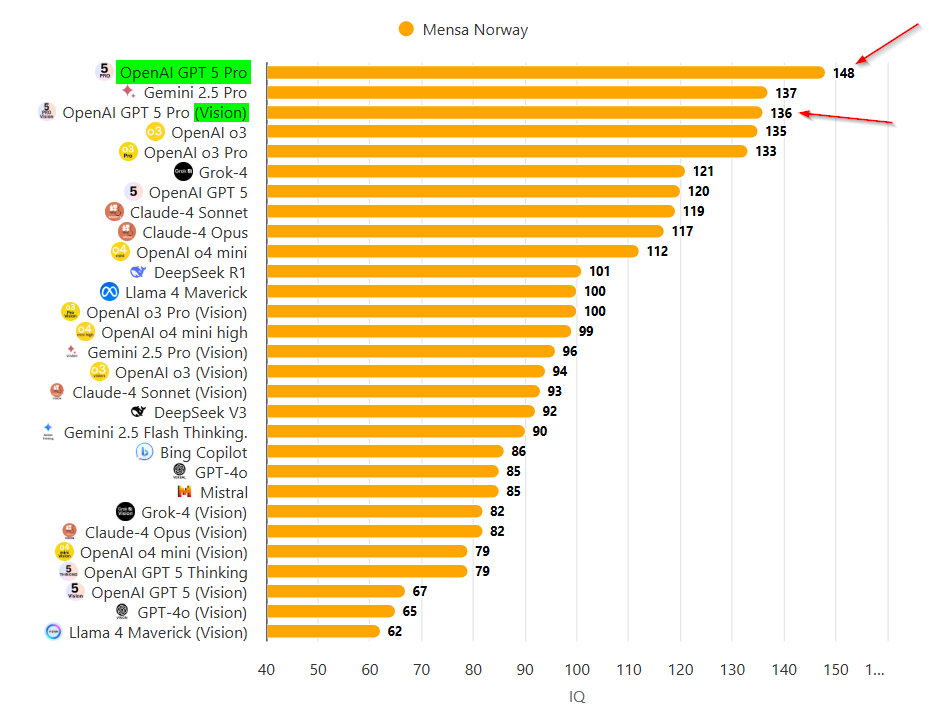 按刚刚放出的门萨测试的结果,GPT-5 Pro普通版和Vision版的智商,分别为148和136。