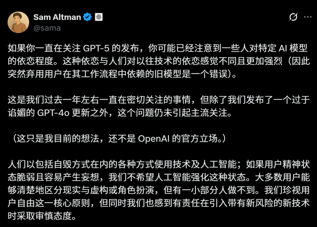 在这之前,奥特曼从未想过,那个被嘲笑是「谄媚精」「应声虫」的GPT-4o,居然是这么多人的心头好?