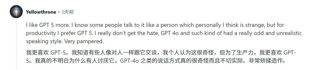 有人多么需要GPT-4o的温情脉脉甚至谄媚,就有人多么讨厌它的矫揉造作,而是欣赏更有生产力和效率的模型。