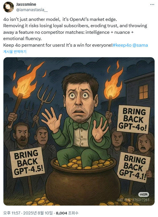 因此,当看到这么多ChatGPT用户哭求让GPT-4o回归,他真的大吃一惊。