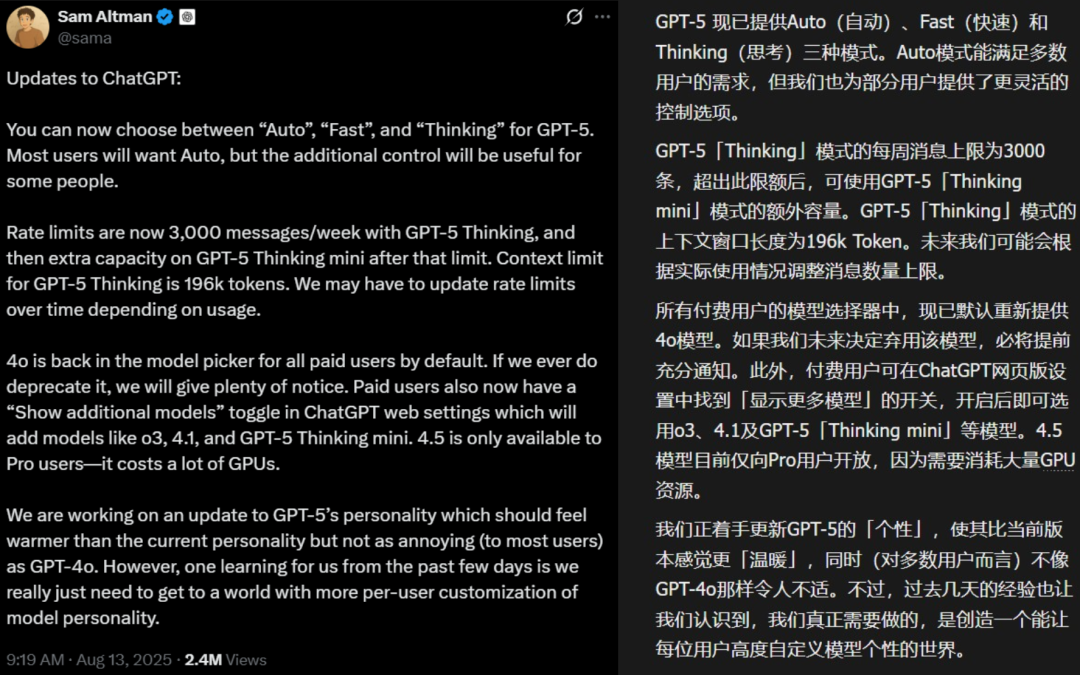 今天,奥特曼在X上官宣:你们的GPT-4o,它回来了!