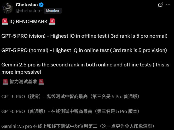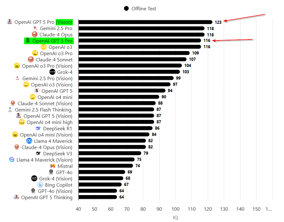 线下测试的版本,则显示GPT-5 Pro Vision和GPT-5 Pro的智商分别为123和116。