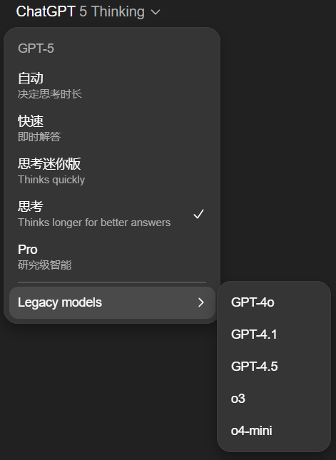 并且在这次更新中,ChatGPT界面又新增了控制选项,GPT-5可以选择Auto、Fast、Thinking mini、Thinking、Pro这几种模式了。