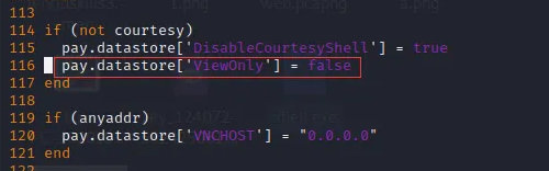 vim /usr/share/metasploit-framework/scripts/meterpreter/vnc.rb 在if (not courtesy)下添加pay.datastore['ViewOnly'] = false