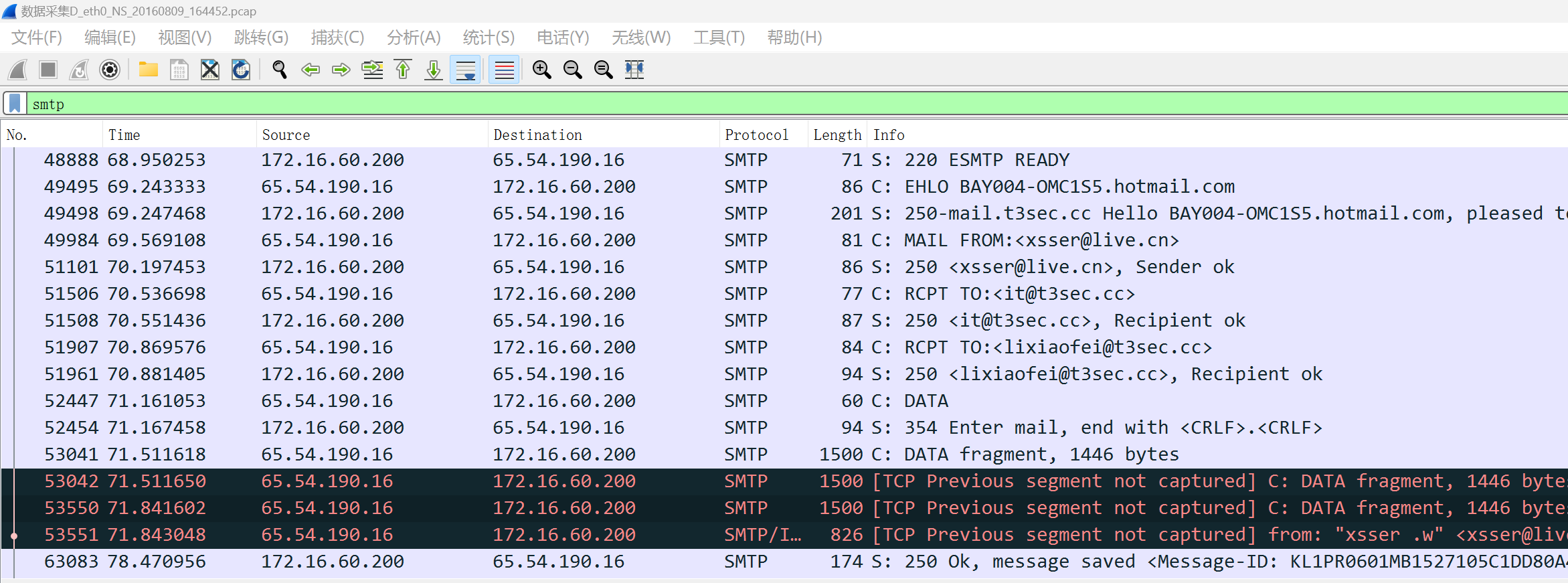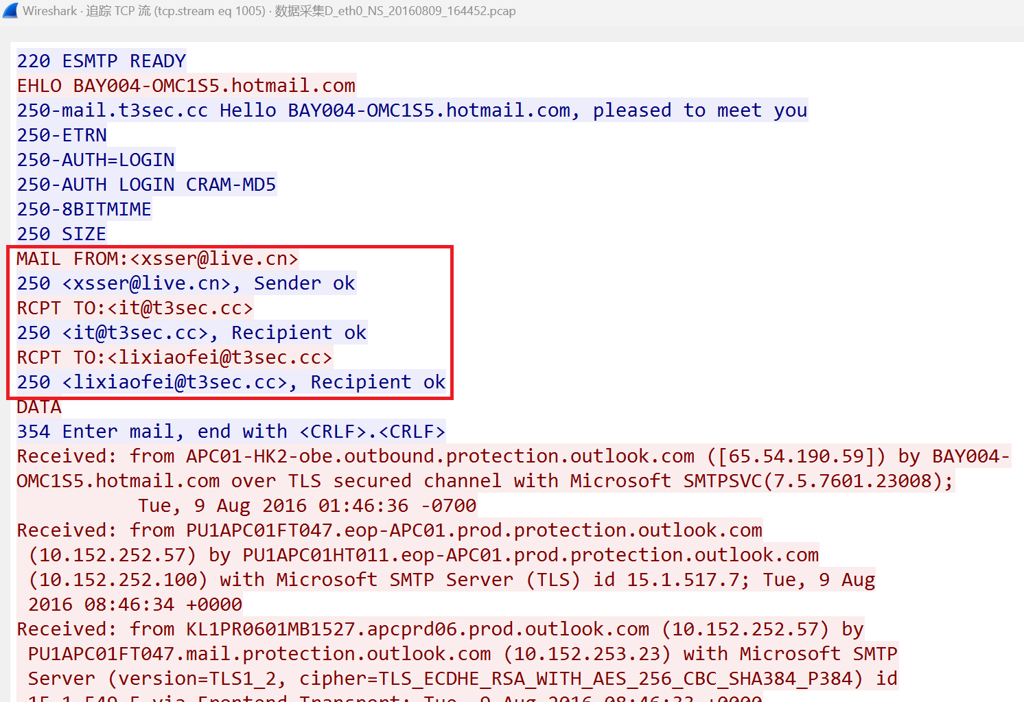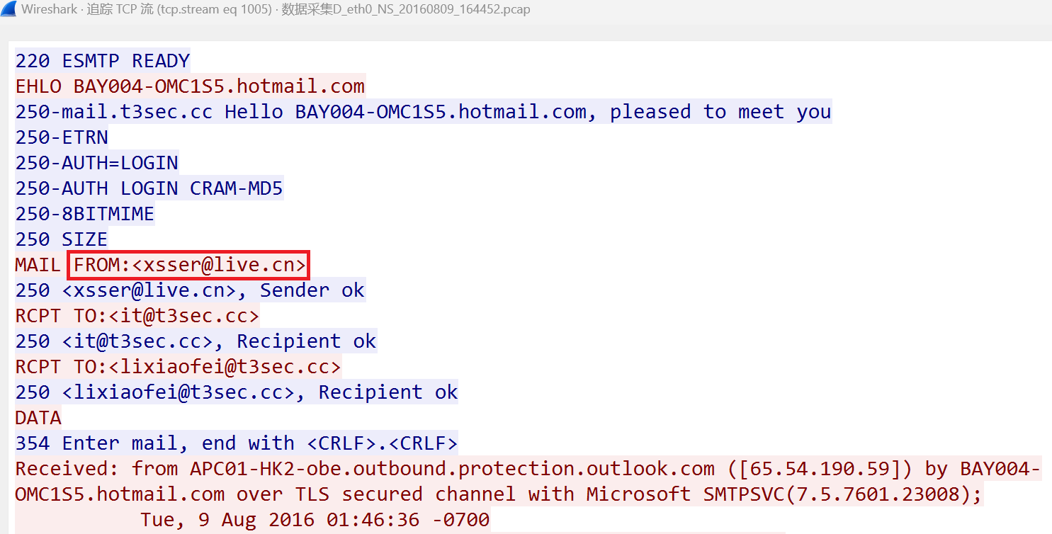 追踪TCP流,发现几个邮箱。(拥有同样后缀@t3sec.cc的邮箱,应该是公司员工的邮箱)