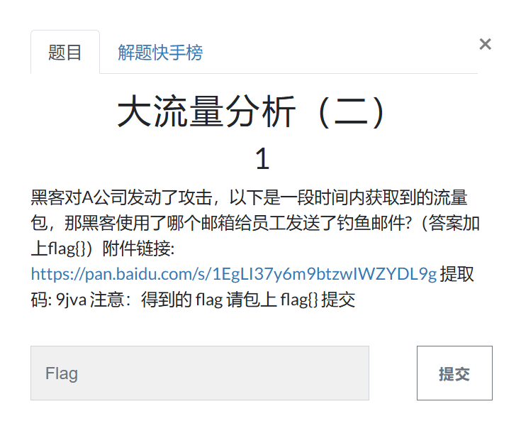 黑客对A公司发动了攻击,以下是一段时间内获取到的流量包,那黑客使用了哪个邮箱给员工发送了钓鱼邮件?(答案加上flag{})附件链接: https://pan.baidu.com/s/1EgLI37y6m9btzwIWZYDL9g 提取码: 9jva 注意:得到的 flag 请包上 flag{} 提交