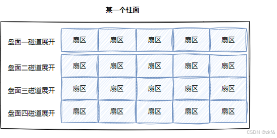 其实磁盘纵向看是柱状的,盘片有俩面,每个面上有很多个磁道,每个磁道在纵向看,是个柱面,每个磁道上有对应扇区。