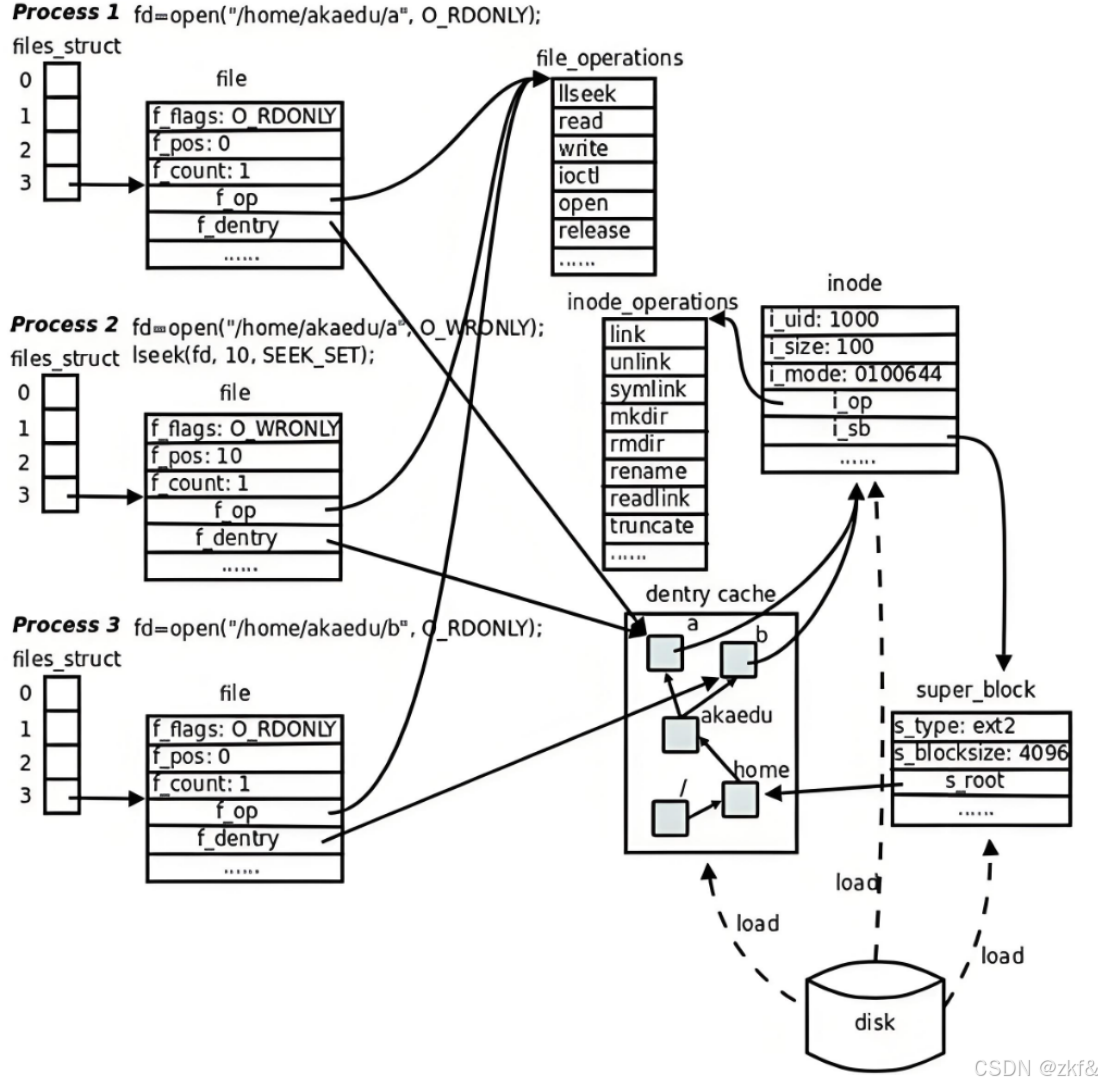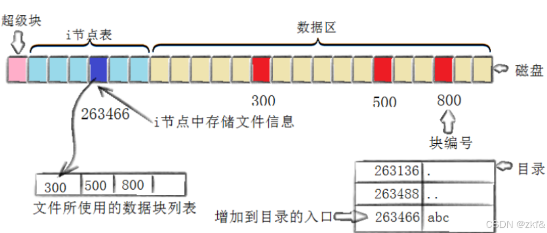 ⽂件内容按顺序300,500,800存放。内核在inode上的磁盘分布区记录了上述块列表。