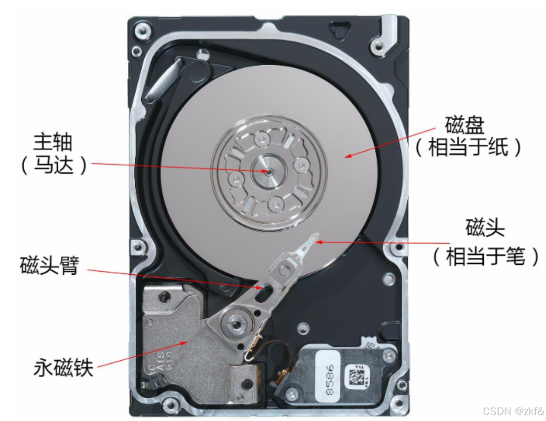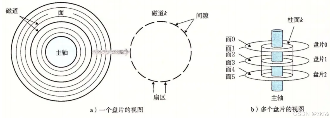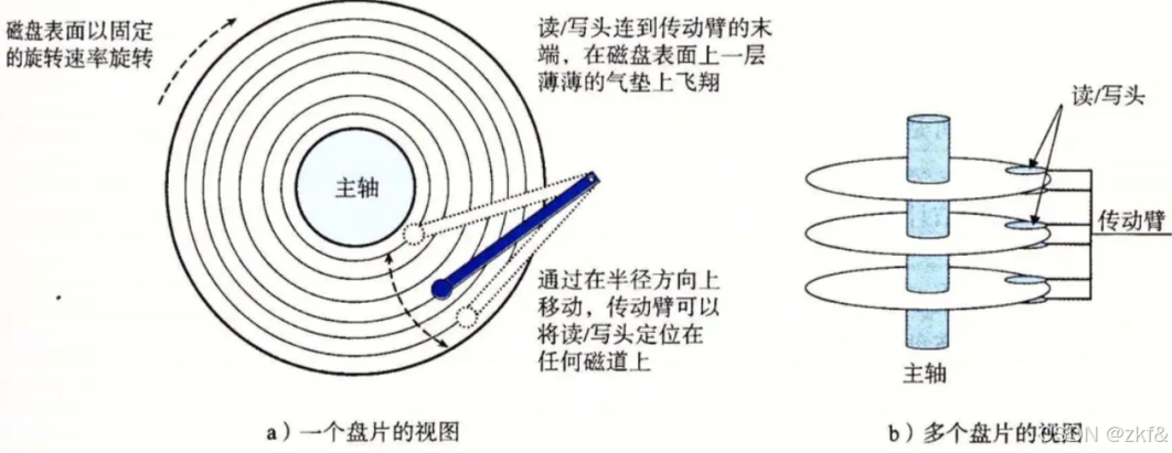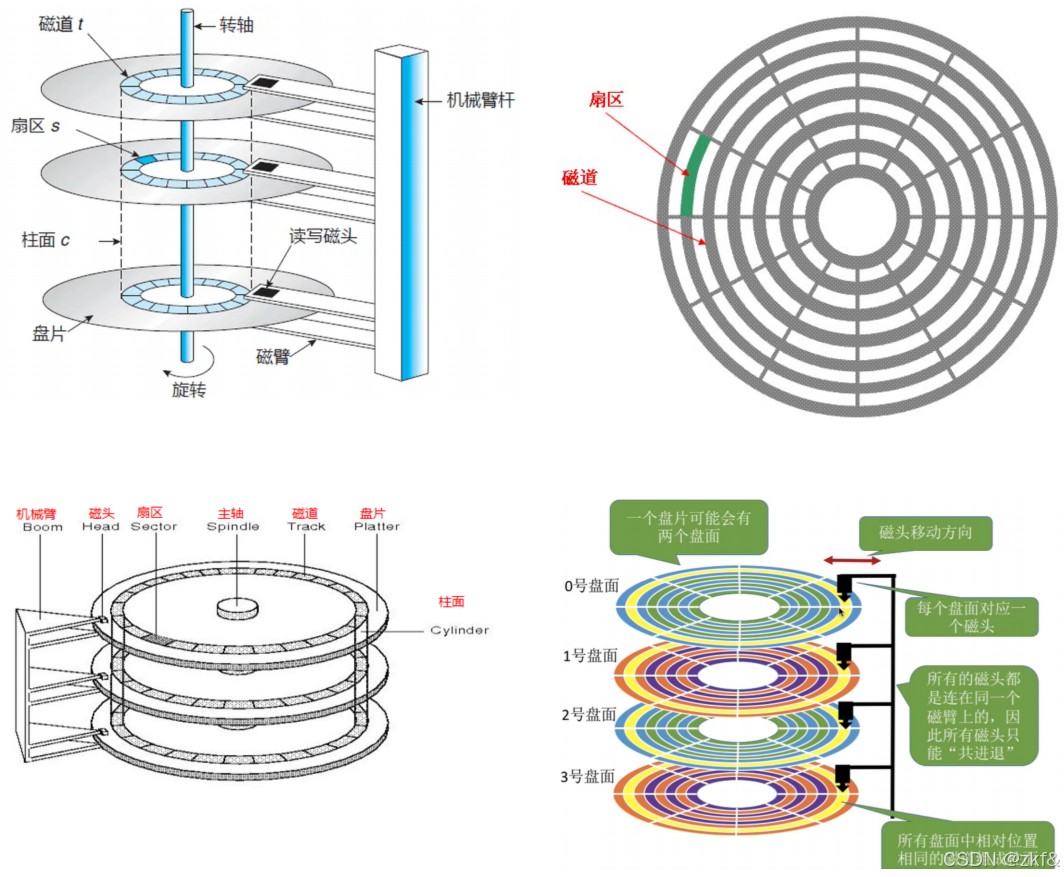 由图可知,磁盘的构造,简单来说,随着磁头臂快速转动,由磁头快速定位到磁盘上的对应扇区位置。