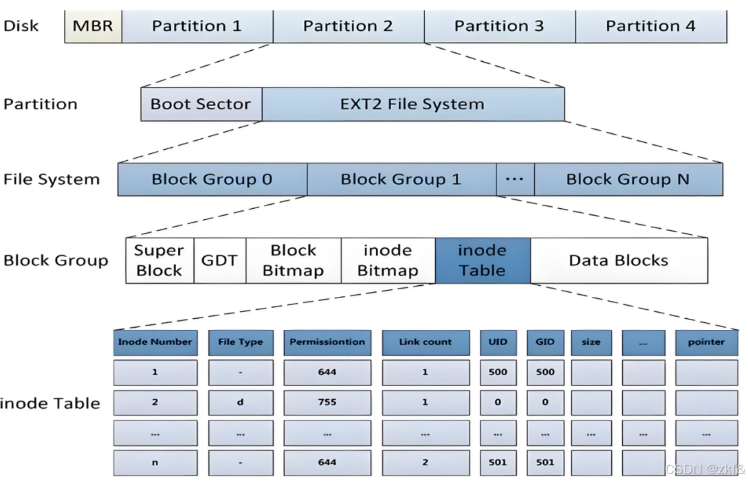 块组描述符表,描述块组属性信息,整个分区分成多个块组就对应有多少个块组描述符。每个块组描述符存储⼀个块组 的描述信息,如在这个块组中从哪⾥开始是inode Table,从哪⾥开始是Data