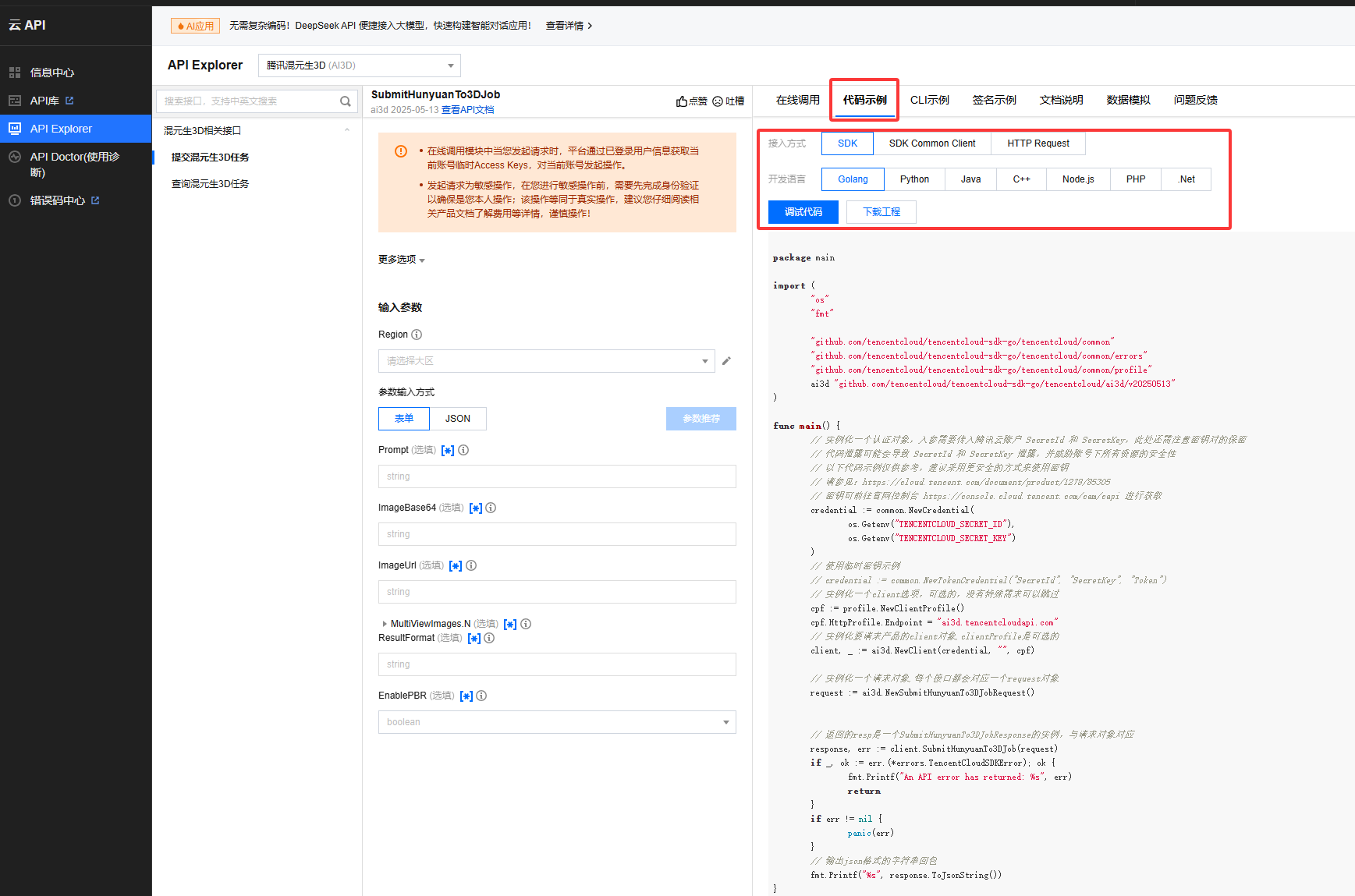 同时,可通过代码示例,查看示例代码,在线调试。调试完成后可下载相应代码工程进行本地调用。