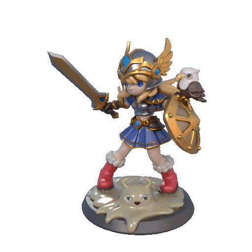 上面这个图是我根据DQ类游戏体验,脑补设计粗来的一个比较经典的女勇者形象,一个手持剑盾,身着华丽头盔和铠甲战裙的虚拟角色,脚下是泡沫小怪物。符合我的刻板印象。整体风格比较二次元呆萌。