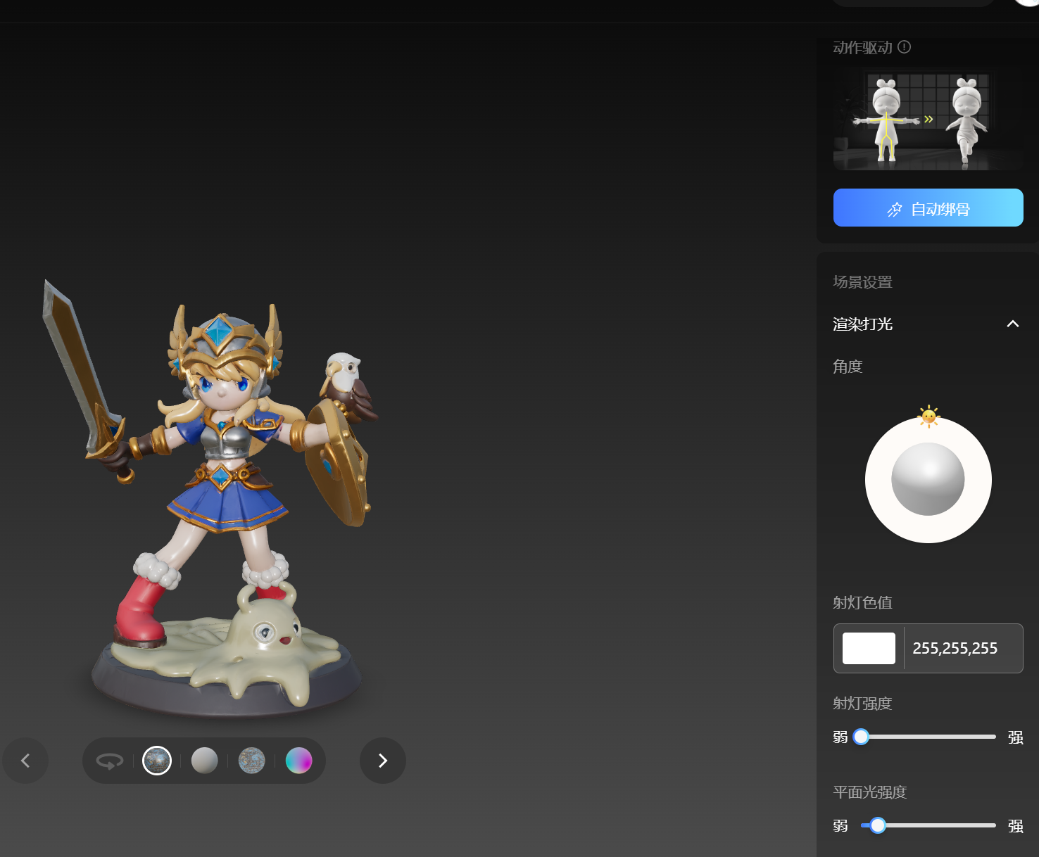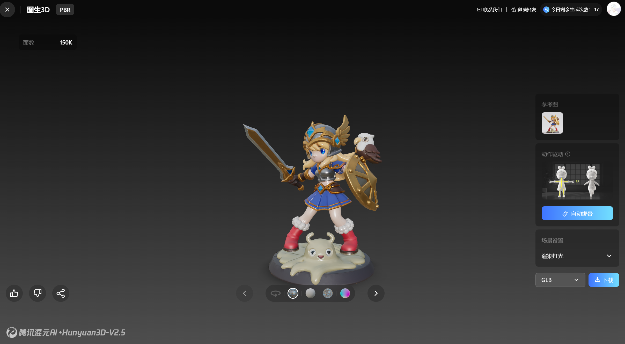 可以导出发布和保存不同格式。AI帮助我们自动生成的内容是完整的3D模型,它包含贴图、UV、PBR 特效等细节,并自动优化光照与材质参数。