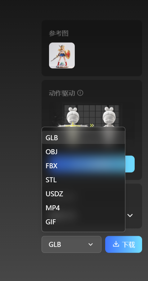 通过AI技术生成定制的3D模型,支持主流3D建模的GLB、OBJ、FBX、STL等不同格式。可能用于3D打印或其他应用。