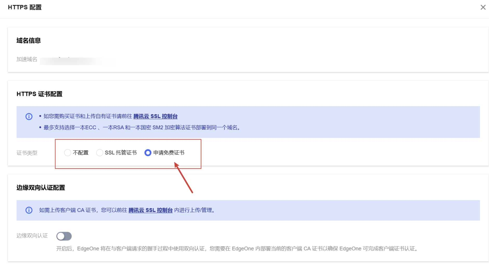 申请免费证书:还未购买 SSL 证书,可通过 EdgeOne 自动完成免费证书申请、部署以及续签,减少运维工作量,当前申请的免费证书是来源于 Let‘s Encrypt 的 RSA 证书。