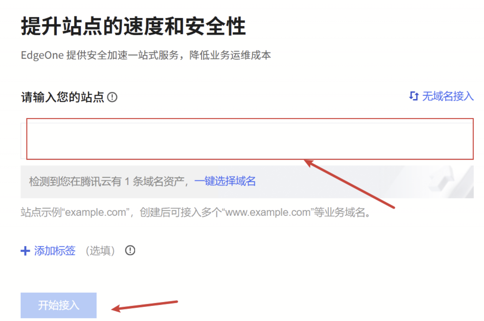 在EdgeOne控制台点击添加站点,输入你的域名。根据实际需求选择加速区域: