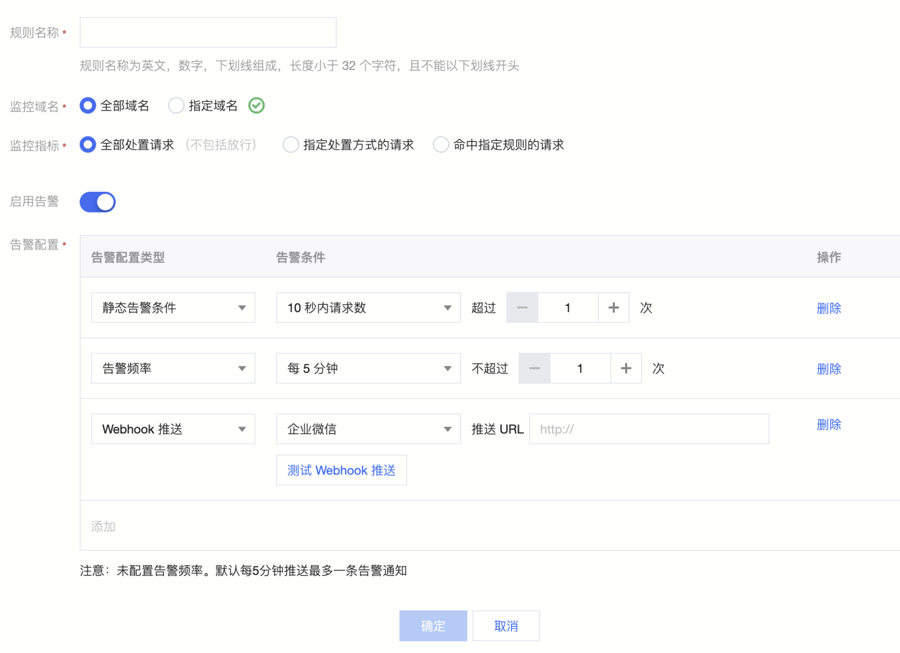 Web 安全监控规则可以提供实时、定制化的安全事件通知,并支持 Webhook 推送,使告警与常用企业通讯工具无缝对接,提高安全运维效率,帮助快速发现并应对潜在风险。可以根据业务需求和风险评估,灵活配置监控范围、阈值和告警频率。
