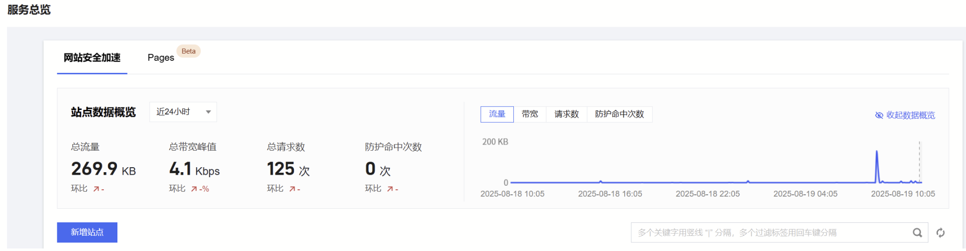 若你有多个处于加速的站点则可以在EdgeOne的服务总览页面看到所有的信息