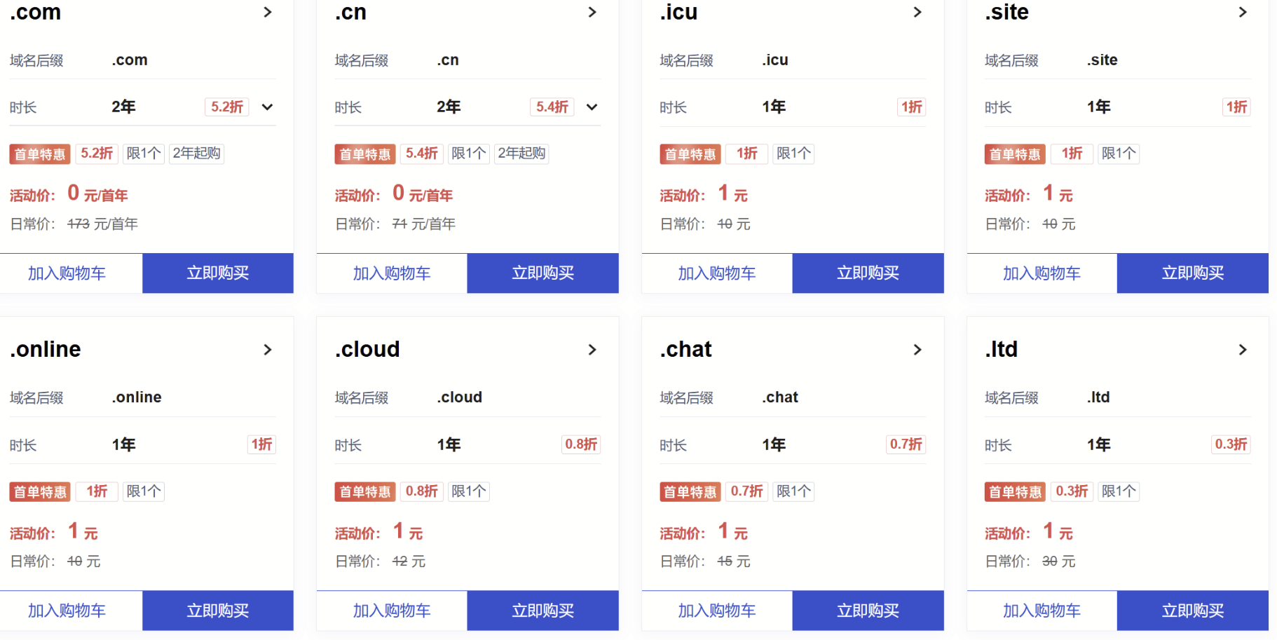 没有域名的小伙伴可以选择登录腾讯云官网,选择适合自己的域名,优先选择.com/.cn,尤其是.com两年下来一张不到,优惠力度十足了