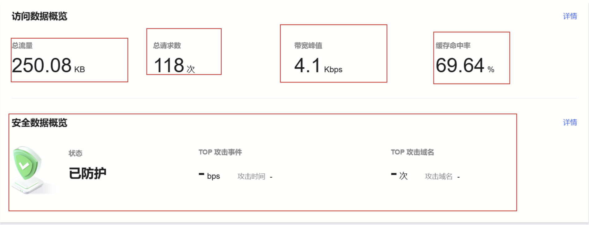 点击站点概览,可以详细看到总流量,总请求数,带宽峰值,缓存命中率,以及安全数据信息