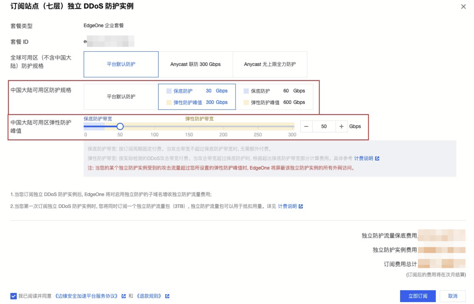 确认相关费用信息后,勾选同意相关用户协议,并单击立即订阅,将开始自动下发独立 DDoS 防护实例配置