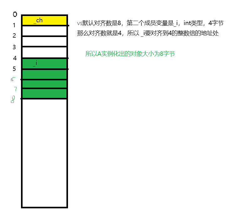 计算A实例化对象的大小A中,存在两个成员变量 ch 与i