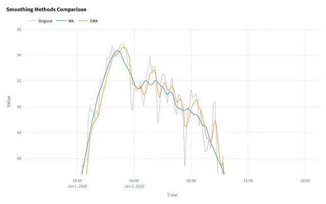 移动平均和指数移动平均平滑方法的延迟效应对比。