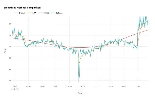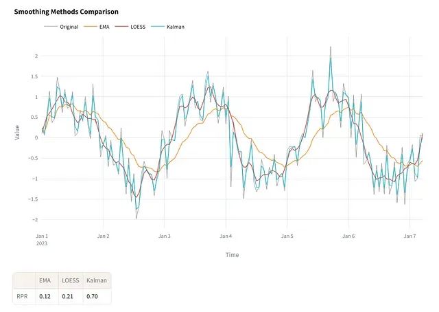 卡尔曼滤波器是一种基于概率论的递归估计算法,专用于从噪声观测数据中估计系统的潜在状态。该算法在每个时间步骤都会基于过程模型进行状态预测,将预测结果与观测数据进行比较,然后更新状态估计以在模型预测和实际测量之间达到最优平衡。与EMA类似,卡尔曼滤波器也属于因果平滑方法。
