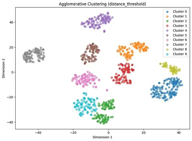 分析结果显示,轮廓系数达到0.6012,调整兰德指数为0.8686。这表明无论指定聚类数量(n_clusters)还是让算法自动发现聚类(distance_threshold),在当前数据集上的聚类结果基本一致。层次聚类算法很好地捕捉了数据的潜在结构特征。