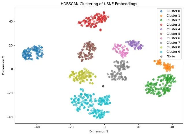 plt.title("HDBSCAN Clustering of t-SNE Embeddings")
